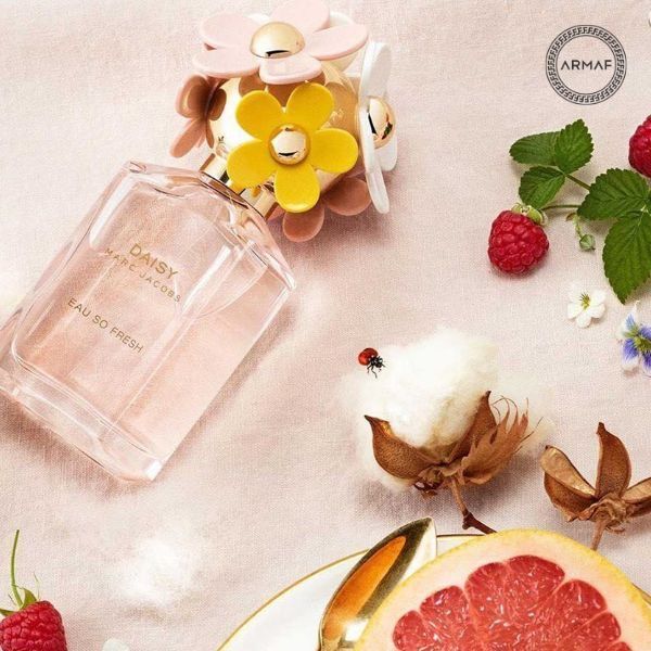 Daisy Eau So Fresh mang hương hoa - trái cây tươi trẻ như một khu vườn cổ tích. Hương đầu sống động với bưởi, mâm xôi và lê; tầng giữa trở nên êm dịu nhờ hoa hồng, violet, nhài và táo. Hương cuối của gỗ tuyết tùng, xạ hương và mận mang đến sự hấp dẫn nhẹ nhàng, khiến chai nước hoa càng thêm đáng yêu.