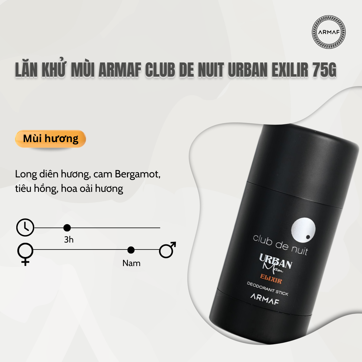 Lăn khử mùi Armaf Club De Nuit Man Urban Exilir ra đời nhờ sự kết hợp giữa mùi hương của long diên hương, cam Bergamot, tiêu hồng, hoa oải hương kết tạo nên một mùi hương đậm vẻ nam tính và quyến rũ cho phái mạnh.