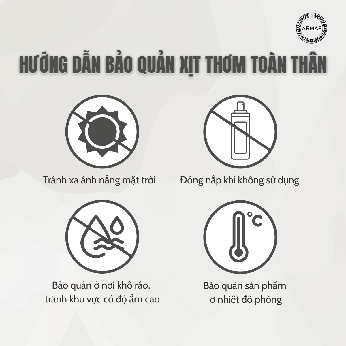 • Cách sử dụng: Lắc nhẹ chai xịt thơm toàn thân. Đưa vòi xịt hướng về phần cơ thể mà bạn muốn xịt, giữ khoảng cách tối thiểu từ 15 - 20cm, sau đó ấn mạnh nút trên chai xịt và xịt dứt khoát vào vị trí cơ thể đã xác định.